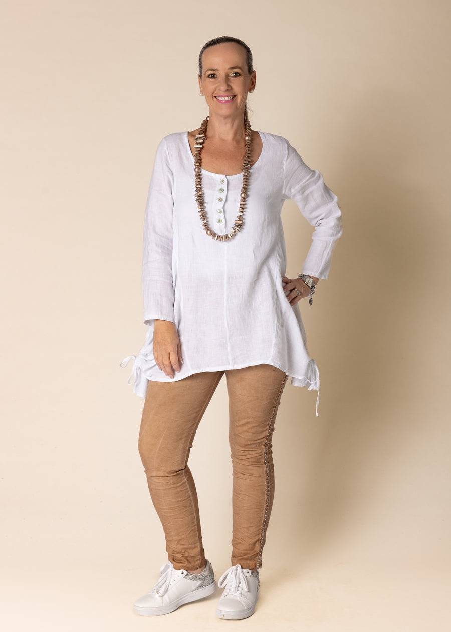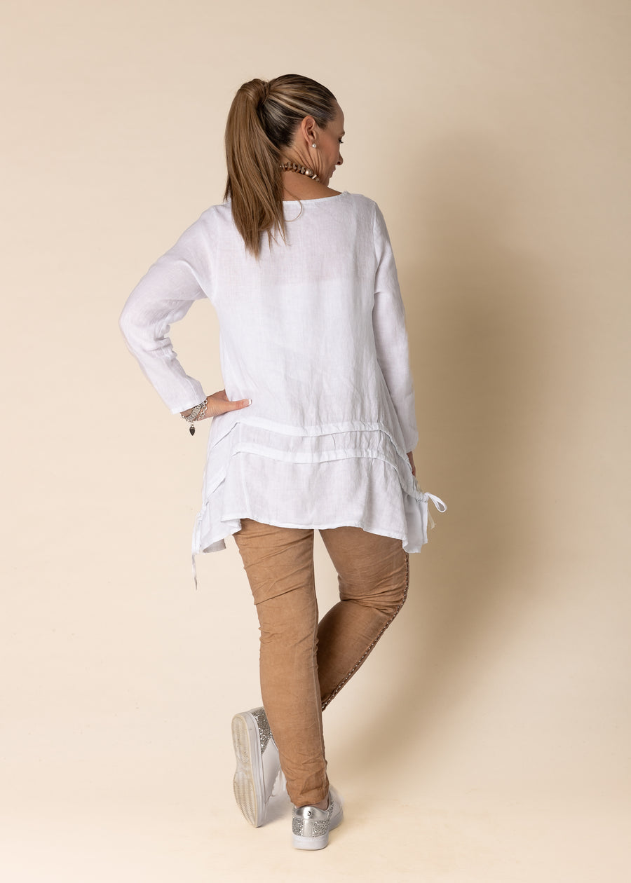 The Alexandra Linen Top features a scooped neckline with a button-down tab, offering a subtle yet stylish detail. It has long inset sleeves, with featured side panels, the back include two drawstrings that tie off at the sides, creating an eye-catching detail.