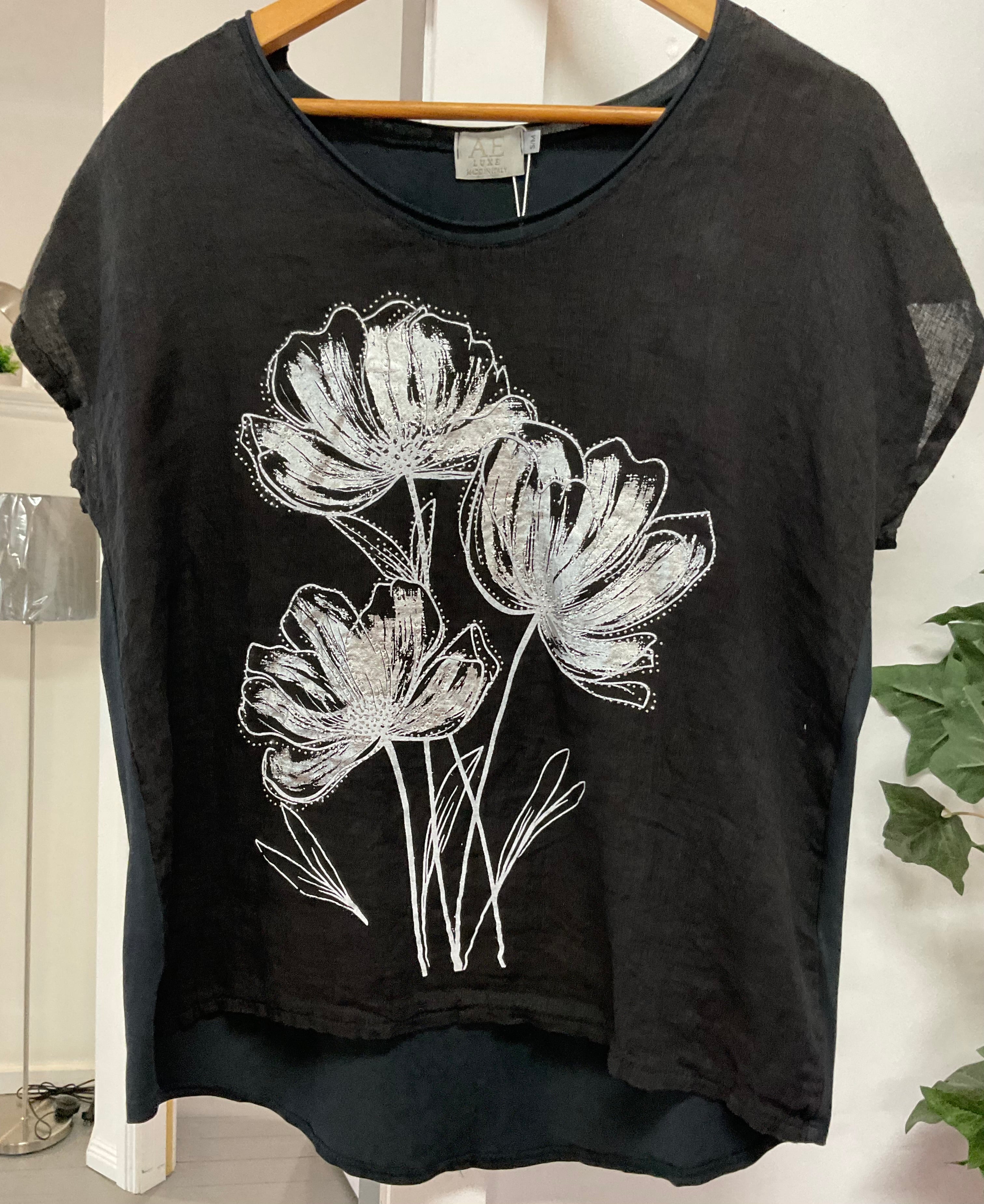 Metalic Flower Print Linen Top - Black