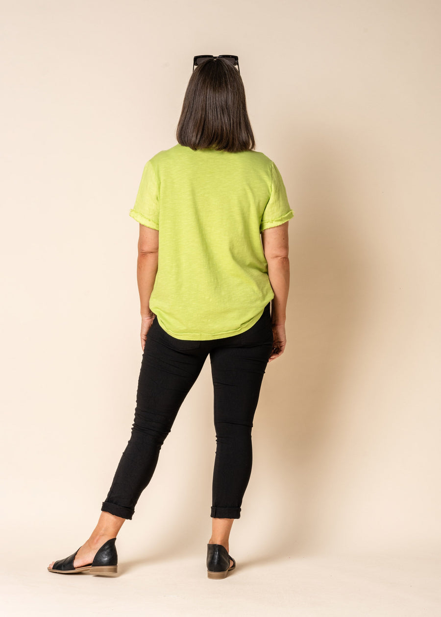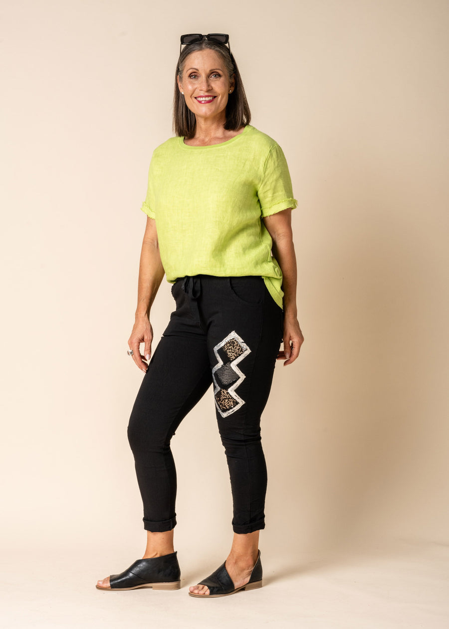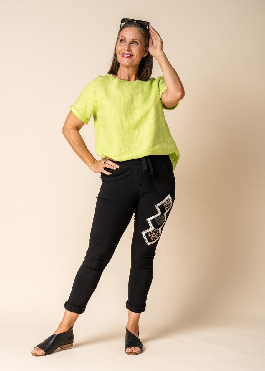 The Sara Pants combine comfort and style with an elastic and drawstring waist, in a Viscose blend to give that stretch that ensures a perfect fit. These pants feature a false fly, front and back pockets for practicality, and a unique silver and sequin diamond design on one leg, adding a touch of glamour to your outfit.