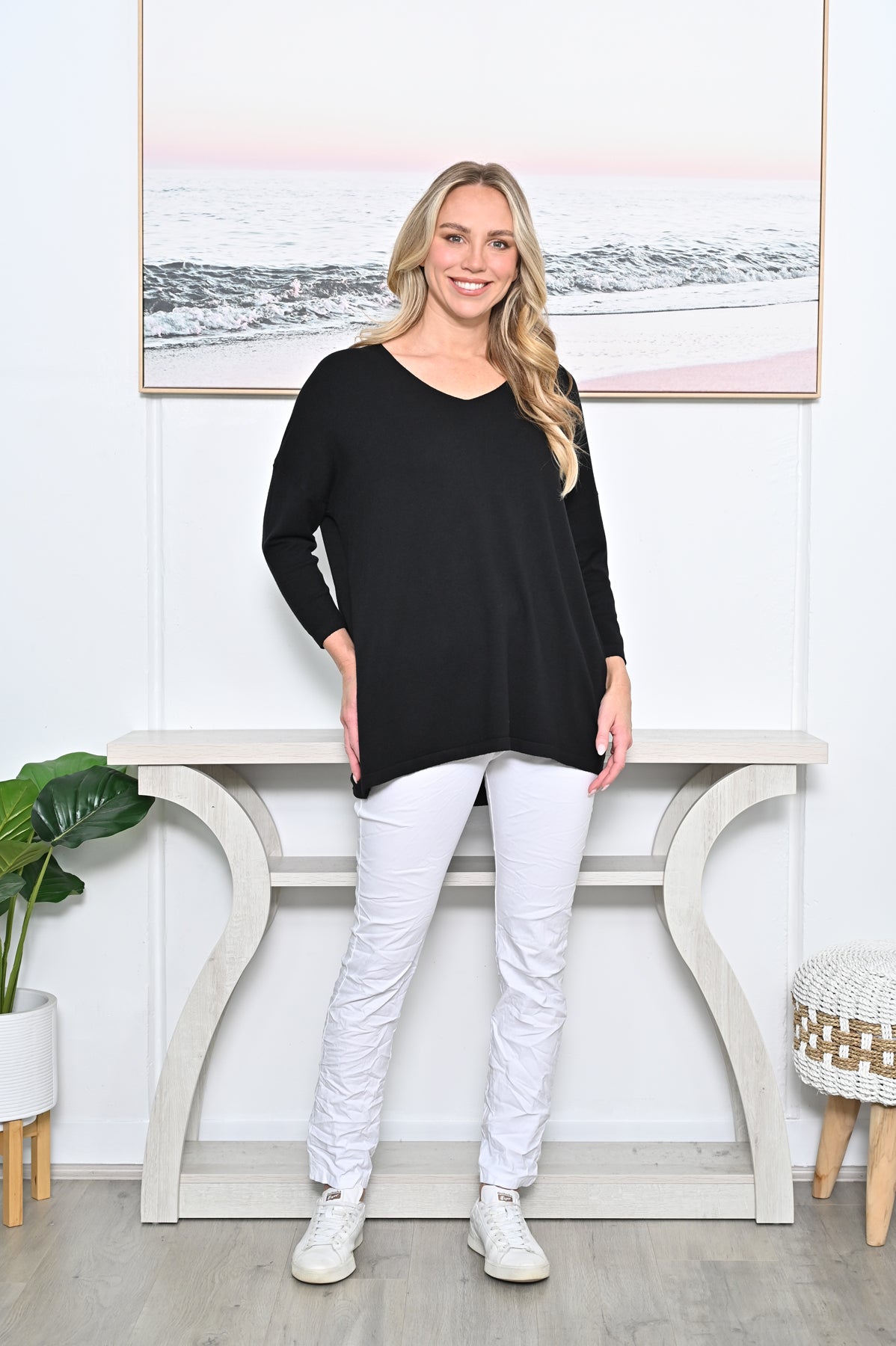 The flattering wide neckline and relaxed fit create a comfortable drape, while the soft knit fabric provides warmth without feeling heavy. The standout feature is the decorative button detail running down the back, adding a subtle yet stylish touch that makes this knit a little different from your everyday jumper.